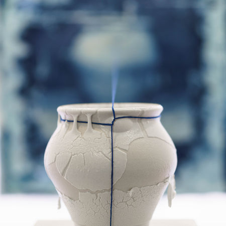 Connected Fragments tells about the direct relationship between object and its portraitures. Pottery object deals with fragmented glaze surfaces and enlarged cyanotype pottery portrait printed on canvas and custom-made paper called Jumchi made by Korean traditional paper making technique.
